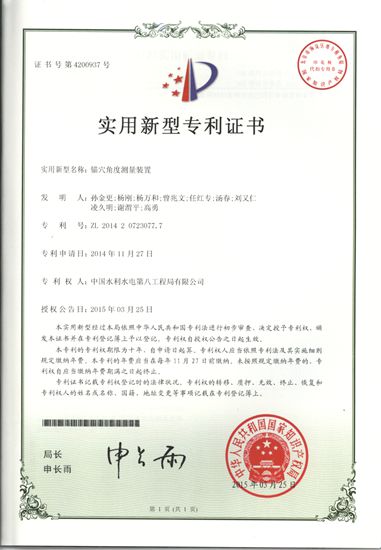 水電八局研制的“錨穴角度測量裝置”獲實(shí)用新型專利權(quán)