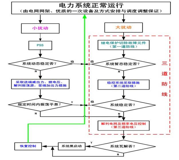 穩(wěn)定控制系統(tǒng)是基于對(duì)電網(wǎng)的穩(wěn)定分析而配置的,它只針對(duì)預(yù)想的運(yùn)行方式、預(yù)定的故障類型,如果出現(xiàn)了預(yù)想以外的方式或故障,則穩(wěn)控系統(tǒng)不能保證電網(wǎng)的穩(wěn)定性,即第二道防線是人們主動(dòng)出擊采取的措施;