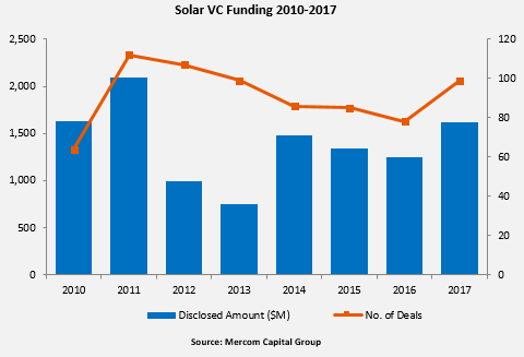 具體來看,2017年,全球太陽能行業(yè)風(fēng)險投資達到了16億美元,涉及交易99個,較之2016年的78個交易累計13億美元融資上漲30%,這主要得益于印度的幾筆大型私人股權(quán)交易。
