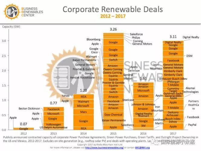 各國(guó)公司以可再生能源供電為榮,這一趨勢(shì)還在持續(xù)擴(kuò)大。到2017年止,各國(guó)大公司(如谷歌、Facebook)簽下的可再生能源供電累計(jì)達(dá)到10吉瓦,其中3吉瓦是2017年新簽購(gòu)電合同。