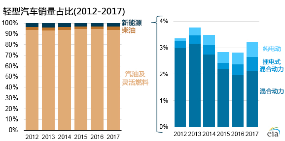 美國能源信息署近期公布的消息顯示,2012年至2017年,美國新能源汽車在輕型汽車銷量中穩(wěn)定占有2.5%到4%的比例。其中,混合動力汽車銷售占比最大,但該占比由于近年來插電式混合動力汽車和純電動汽車銷售占比的少量增長而有所減少。