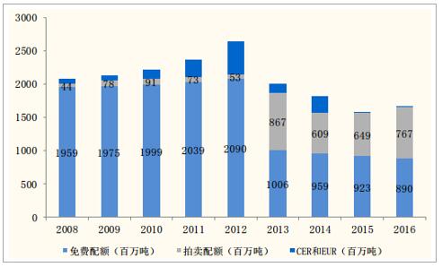 在第一和第二階段,采用“自上而下”的分配方式。歐盟委員會(huì)根據(jù)“總量控制、負(fù)擔(dān)均分”的原則,依照歐盟整體的減排目標(biāo)和各成員國的減排承諾,在歐盟內(nèi)部協(xié)調(diào)確定各個(gè)成員國分擔(dān)的減排義務(wù)。每個(gè)歐盟成員國要提交一份國家分配計(jì)劃(NAP),包含各個(gè)設(shè)施的排放總量。NAP由歐盟委員會(huì)修改審查通過后,排放總量被轉(zhuǎn)化為配額,由各國根據(jù)其NAP分配到每個(gè)設(shè)施。前兩個(gè)階段碳配額以免費(fèi)分配為主(約90%),第三階段拍賣方式發(fā)放比例大幅提升。前兩階段的實(shí)際拍賣量從第一階段的300萬噸(占比0.13%)到第二階段的750萬噸(占比4%),和歐盟期望的5%-10%的目標(biāo)仍有差距,但有償分配方式已逐漸成型。自2013年第三階段開始力推配額拍賣方式,拍賣方式發(fā)放配額比例大幅上升,占配額總量的一半以上。配額上限過高和經(jīng)濟(jì)危機(jī)沖擊導(dǎo)致配額過剩。歐盟碳排放交易體系建立之初,是由各成員國自行設(shè)定排放量配額上限。過高的上限使得EUETS在2007年底第一階段結(jié)束之際,實(shí)際二氧化碳排放量比設(shè)定配額還要低7%。2008年經(jīng)濟(jì)危機(jī)以來,歐盟制造業(yè)一蹶不振,大批企業(yè)減產(chǎn)導(dǎo)致二氧化碳排放量急劇下降,同時(shí)企業(yè)還在出售用不完的排放許可權(quán),又增加了配額供應(yīng),使得碳排放配額過剩更加嚴(yán)重,給碳配額價(jià)施加進(jìn)一步下行壓力。直到2014年,整個(gè)EU-ETS中仍有約13億碳排放許可過剩。如果不對交易體系進(jìn)行結(jié)構(gòu)性改革,2020年末過剩配額可能膨脹到45億噸。配額過剩導(dǎo)致EUA現(xiàn)貨價(jià)格低迷?,F(xiàn)貨市場上,過剩的供應(yīng)壓低了污染者的排放成本,導(dǎo)致配額價(jià)格持續(xù)下跌。EU-ETS設(shè)計(jì)初期,每噸碳排放許可交易價(jià)格在25到30歐元之間,在2007年中期曾達(dá)到過35歐元。隨后由于配額過剩,碳排放交易價(jià)格直線下滑,最低時(shí)一度觸及2.5歐元,直至2014年,碳排放交易價(jià)格基本在4.3歐元到5歐元之間。據(jù)能源專家分析,碳價(jià)至少要達(dá)到每噸20歐元才能促使企業(yè)實(shí)施低碳能源策略,極低的配額價(jià)格使生產(chǎn)者以微小代價(jià)即可獲得大量排放許可,不僅不利于減排技術(shù)的進(jìn)步,帶動(dòng)新能源的發(fā)展,甚至還拉動(dòng)了煤炭的銷量,讓整個(gè)歐洲的減排系統(tǒng)走到了崩潰的邊緣。
