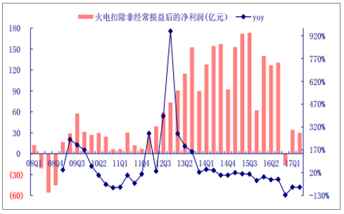 2017年1-6月,火電行業(yè)實現(xiàn)扣非凈利潤63.9億元,較去年同期銳減76%。二季度扣非凈利潤29.8億元,同比減少76.5%,環(huán)比下降12.7%。
