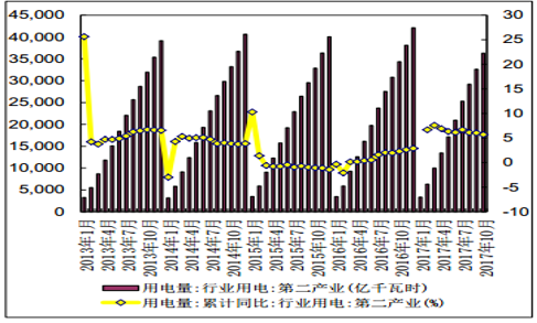 2017年1-11 月份,全國(guó)全社會(huì)用電量 57331 億千瓦時(shí),同比增長(zhǎng) 6.5%,增速比上年同期提高 1.5 個(gè)百分點(diǎn)。1-11 月份,第一產(chǎn)業(yè)用電量 1074 億千瓦時(shí),同比增長(zhǎng) 7.1%,占全社會(huì)用電量的比重為 1.9%;第二產(chǎn)業(yè)用電量 40185 億千瓦時(shí),同比增長(zhǎng) 5.5%,增速比上年同期提高 2.9 個(gè)百分點(diǎn),占全社會(huì)用電量的比重為 70.1%,對(duì)全社會(huì)用電量增長(zhǎng)的貢獻(xiàn)率為 59.8%;第三產(chǎn)業(yè)用電量 8054 億千瓦時(shí),同比增長(zhǎng) 10.5%,增速比上年同期回落1.1 個(gè)百分點(diǎn),占全社會(huì)用電量的比重為 14.0%,對(duì)全社會(huì)用電量增長(zhǎng)的貢獻(xiàn)率為 21.9%;城鄉(xiāng)居民生活用電量 8018 億千瓦時(shí),同比增長(zhǎng) 7.7%,增速比上年同期回落 3.8 個(gè)百分點(diǎn),占全社會(huì)用電量的比重為 14.0%,對(duì)全社會(huì)用電量增長(zhǎng)的貢獻(xiàn)率為 16.3%。