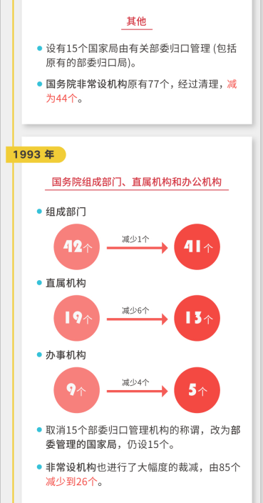 到1993年,國務院工作部門又增加至86個,于是啟動了第三次改革。經(jīng)過調(diào)整,國務院組成部門調(diào)整為41個,直屬機構(gòu)調(diào)整為13個,辦事機構(gòu)調(diào)整為5個。