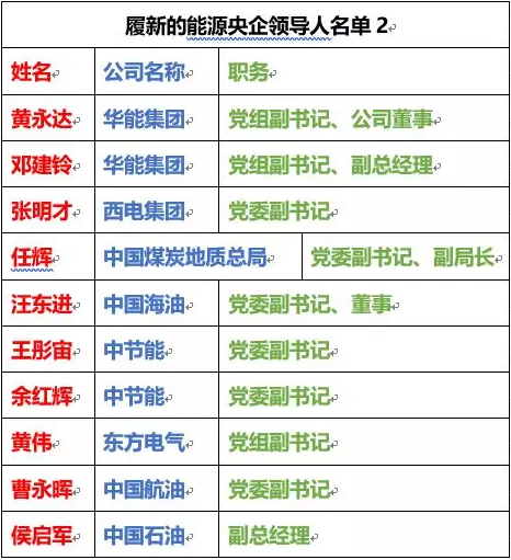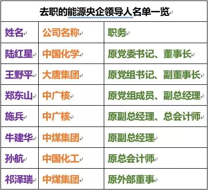 被去職,在國務(wù)院務(wù)國資委官網(wǎng)尚未發(fā)現(xiàn)有新的職位任命的能源央企領(lǐng)導(dǎo)人有中國化學(xué)原黨委書記、董事長陸紅星、大唐集團(tuán)原黨組書記、副董事長王野平、中廣核集團(tuán)原黨組成員、副總經(jīng)理鄭東山、中廣核集團(tuán)原副總經(jīng)理、總會(huì)計(jì)師施兵、中煤集團(tuán)原副總經(jīng)理牛建華、中國化工原總會(huì)計(jì)師孫航和中煤集團(tuán)原外部董事祁澤瑞7人。