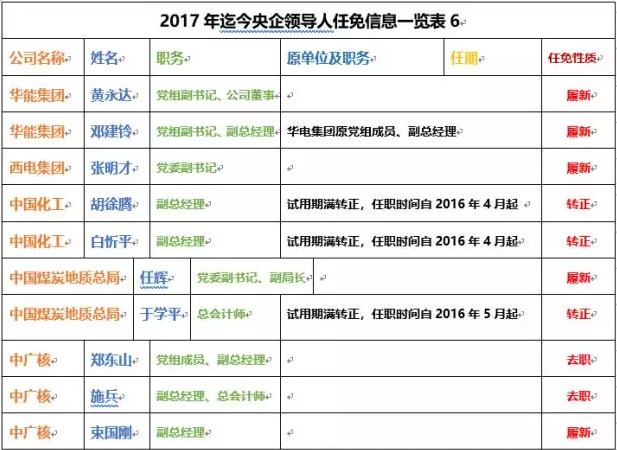 4、國資黨任字[2017]111號(hào):曹永暉任中國航油黨委副書記,徐華(女)任中國航油黨委常委、紀(jì)委書記;免去曹永暉的中國航油紀(jì)委書記職務(wù)。
