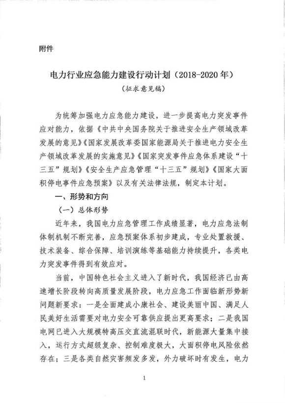 國家能源局綜合司關(guān)于征求《電力行業(yè)應(yīng)急能力建設(shè)行動計劃(2018-2020年)》(征求意見稿)意見的函,內(nèi)容如下: