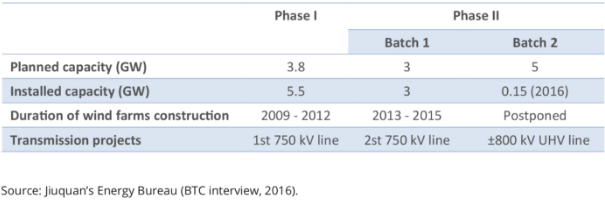 2015年第二階段第一批風(fēng)電建設(shè)完成后,限電情況最為嚴(yán)重。作為回應(yīng),國(guó)家能源局停止了甘肅、新疆、內(nèi)蒙古等省的風(fēng)電項(xiàng)目審批和建設(shè)。雖然第二批酒泉風(fēng)力發(fā)電項(xiàng)目的初期工作已經(jīng)開(kāi)始,但由于風(fēng)電限電情況嚴(yán)峻,風(fēng)電場(chǎng)的建設(shè)仍舊被迫推遲。有關(guān)方面繼而將希望寄托于在規(guī)劃中、從甘肅酒泉到湖南株洲的800千伏特高壓直流輸電工程。