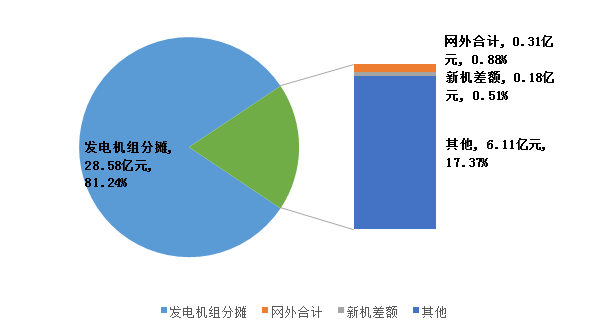 從電力輔助服務(wù)補償費用來源來看,主要來自發(fā)電機組分攤費用,合計28.58億元,占比為81.24%。其他還有,跨省區(qū)(網(wǎng)外)輔助服務(wù)補償分攤費用合計0.31億元,新機差額資金0.18億元,考核等其他費用6.11億元,無分攤減免費用(見圖4)