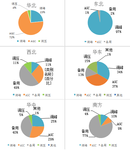 從分項電力輔助服務(wù)補償費用來看,調(diào)峰、AGC和備用補償費用占總補償費用的90%以上。其中,西北、東北區(qū)域調(diào)峰補償力度最大,華北、華東區(qū)域調(diào)頻(西北區(qū)域調(diào)頻為AGC加一次調(diào)頻,其他區(qū)域調(diào)頻為AGC)補償力度最大,南方、華中區(qū)域備用補償力度最大??傮w來看,西北區(qū)域整體電力輔助服務(wù)補償力度最大(見圖3)。