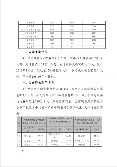 國家能源局河南監(jiān)管辦公室日前發(fā)布了《2018 年4月份河南電網調度運行監(jiān)管信息分析》,其中一、電力平衡情況:4月份用電最高負荷出現(xiàn)在4日,達到3694萬千瓦,較上月最高負荷減少396萬千瓦,較去年同期最高負荷增加259萬千瓦。二、電量平衡情況:4月份發(fā)電量達到206.9億千瓦時,聯(lián)絡線受電量26.73億千瓦時,用電量233.64億千瓦時,發(fā)電最高負荷3563萬千瓦。三、發(fā)電設備利用情況:4月份全網平均發(fā)電負荷率58.44%,全網月平均運行備用容量360萬千瓦,全網月最大運行備用容量430萬千瓦,全網月最小運行備用容量320萬千瓦。