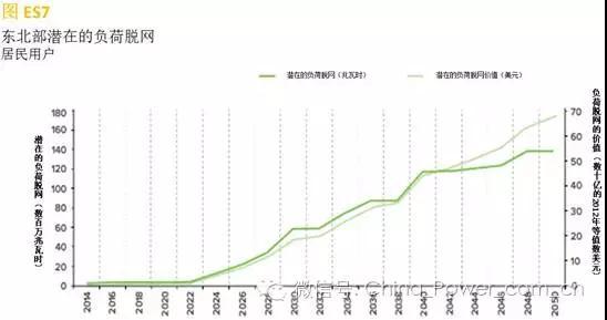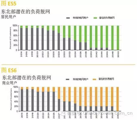 2010年至2030年間,電網(wǎng)將需要金額高達(dá)2萬億美元的投資,或者說每年投資金額達(dá)1000億美元 。 目前,這些投資將通過銷售電量獲得的收入收回。如果支持該投資的銷售電量收入中的一小部分流失掉的話,系統(tǒng)的經(jīng)濟(jì)效益都會(huì)受到很大的影響 。值得注意的是,我們的分析顯示,聯(lián)網(wǎng)的太陽能發(fā)電+電池儲(chǔ)能系統(tǒng)將給大量用戶帶來經(jīng)濟(jì)效益,而且這一系統(tǒng)將會(huì)向越來越多的用戶供應(yīng)電力。假設(shè)用戶根據(jù)最佳經(jīng)濟(jì)性而選擇電力供應(yīng)方式,則可能發(fā)生大規(guī)模的用戶負(fù)荷脫網(wǎng)。例如,在美國東北部,到15年之后的2030年,對電量銷售的最大侵蝕可能是: