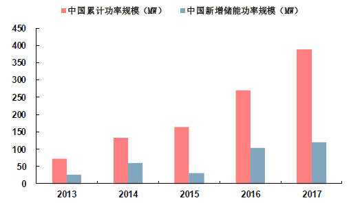 電化學(xué)儲(chǔ)能現(xiàn)總體規(guī)模占比較小,但近幾年發(fā)展迅猛。根據(jù)CNESA項(xiàng)目庫(kù)的不完全統(tǒng)計(jì),截止2017年底全球已投運(yùn)儲(chǔ)能項(xiàng)目累計(jì)裝機(jī)規(guī)模為175.4GW,抽水儲(chǔ)能占比達(dá)到96%,其次為電化學(xué)儲(chǔ)能,占比為1.7%。雖然目前電化學(xué)儲(chǔ)能占比較小,但卻是發(fā)展速度最快的儲(chǔ)能技術(shù),2012~2016年全球電化學(xué)儲(chǔ)能累計(jì)裝機(jī)量復(fù)合增長(zhǎng)率達(dá)到32%。截止2017年底全球已投運(yùn)電化學(xué)儲(chǔ)能項(xiàng)目累計(jì)功率規(guī)模為2926.6MW,新增規(guī)劃、在建的電化學(xué)儲(chǔ)能項(xiàng)目裝機(jī)規(guī)模為3063.7MW;國(guó)內(nèi)已投運(yùn)電化學(xué)儲(chǔ)能累計(jì)規(guī)模為389.8MW,新增規(guī)劃、在建裝機(jī)規(guī)模為705.3MW,預(yù)計(jì)新建項(xiàng)目的陸續(xù)投產(chǎn)將支撐電化學(xué)儲(chǔ)能維持較高增速。
