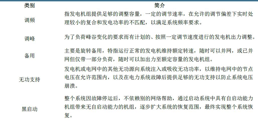 電力市場(chǎng)輔助服務(wù)是指為維護(hù)電力系統(tǒng)的安全穩(wěn)定運(yùn)行,保證電能質(zhì)量,除正常電能生產(chǎn)、輸送、使用外,由發(fā)電企業(yè)、電網(wǎng)經(jīng)營(yíng)企業(yè)和電力用戶(hù)提供的服務(wù)。其主要內(nèi)容包括:一次調(diào)頻、自動(dòng)發(fā)電控制(AGC)、調(diào)峰、無(wú)功調(diào)節(jié)、備用、黑啟動(dòng)等。其中,發(fā)電機(jī)組的一次調(diào)頻、設(shè)計(jì)功率因素范圍內(nèi)的無(wú)功調(diào)整和機(jī)組設(shè)計(jì)調(diào)峰率以?xún)?nèi)的調(diào)峰屬于無(wú)償且必備的基本輔助服務(wù)。而有償輔助服務(wù)指除基本輔助服務(wù)之外的其他輔助服務(wù),包括AGC、備用、無(wú)功服務(wù)和黑啟動(dòng)等。