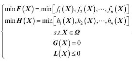 其中,F(xiàn)為微電網(wǎng)運行中經(jīng)濟效益和環(huán)境成本優(yōu)化目標,H為負荷調(diào)度過程中負荷平滑度以及負荷峰值目標,fi為第i個微電網(wǎng)運行中經(jīng)濟效益和環(huán)境成本優(yōu)化子目標,hi為第i個負荷調(diào)度過程中負荷平滑度以及負荷峰值子目標,X為變量因素,Ω是可行解空間,G則代表等式約束條件,L則代表不等式約束條件。
