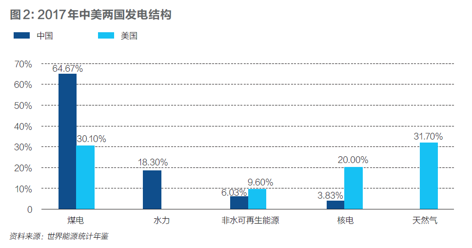 第三,發(fā)電結(jié)構(gòu)的對(duì)比。2017年,中國(guó)發(fā)電總量為6.5萬億千瓦時(shí),世界第一,其中,火力發(fā)電占比約為71.788%,煤電占比為64.67%,是大頭中的大頭;水電占比約為18.3%,風(fēng)電占比為4.54%,太陽能占比1.49%,核能占比3.82%。同年,美國(guó)發(fā)電總量為4.0186萬億千瓦時(shí),世界第二,其中31.7%為天然氣發(fā)電,30.1%為煤電,核電20.0%,非水可再生能源發(fā)電9.6%。當(dāng)前中國(guó)面臨的嚴(yán)重環(huán)境問題,其根源就是我國(guó)的能源消費(fèi)結(jié)構(gòu)、尤其是電力結(jié)構(gòu)帶來的。