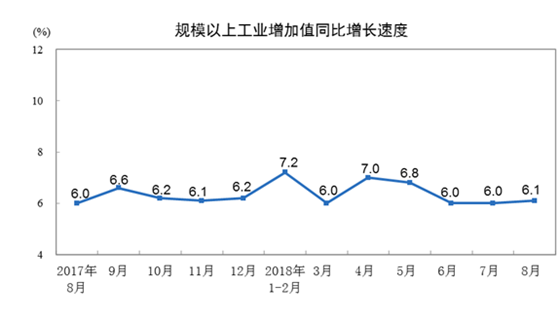 2018年8月份,規(guī)模以上工業(yè)增加值同比實際增長6 1%(以下增加值增速均為扣除價格因素的實際增長率),比7月份加快0 1個百分點。從環(huán)比看,8月份,規(guī)模以上工業(yè)增加值比上月增長0 52%。1-8月份,規(guī)模以上工業(yè)增加值同比增長6 5%,增速較1-7月份回落0 1個百分點。