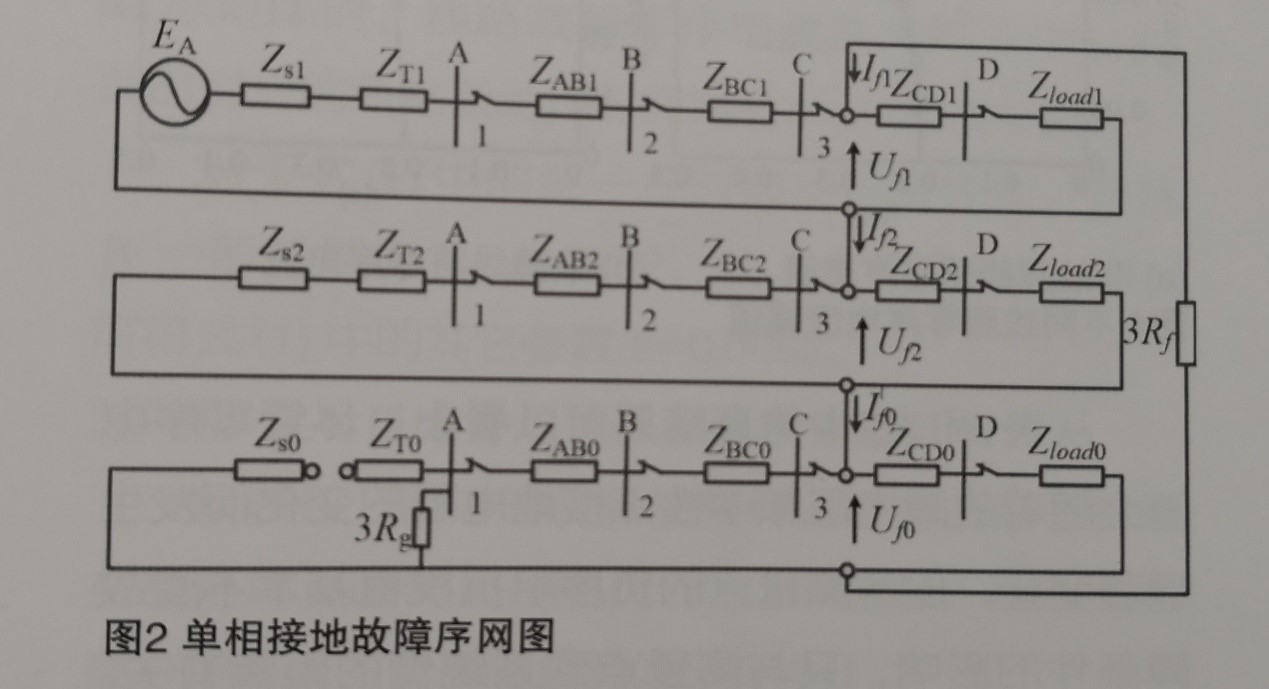 盡管配電網(wǎng)中可能存在大量的分支線路,但負(fù)荷阻抗通過(guò)負(fù)荷變壓器折算到lOkV線路時(shí),負(fù)荷阻抗變得很大,遠(yuǎn)大于10kV饋線自身的阻抗。因此,接地故障產(chǎn)生的負(fù)序電流絕大部分由故障點(diǎn)經(jīng)故障路徑流向系統(tǒng)側(cè),故障點(diǎn)下游流過(guò)的負(fù)序電流相對(duì)很小;從而,負(fù)序阻抗測(cè)量值不受健全線路以及分支線路的影響,只反映故障路徑上測(cè)量點(diǎn)到系統(tǒng)側(cè)的距離。