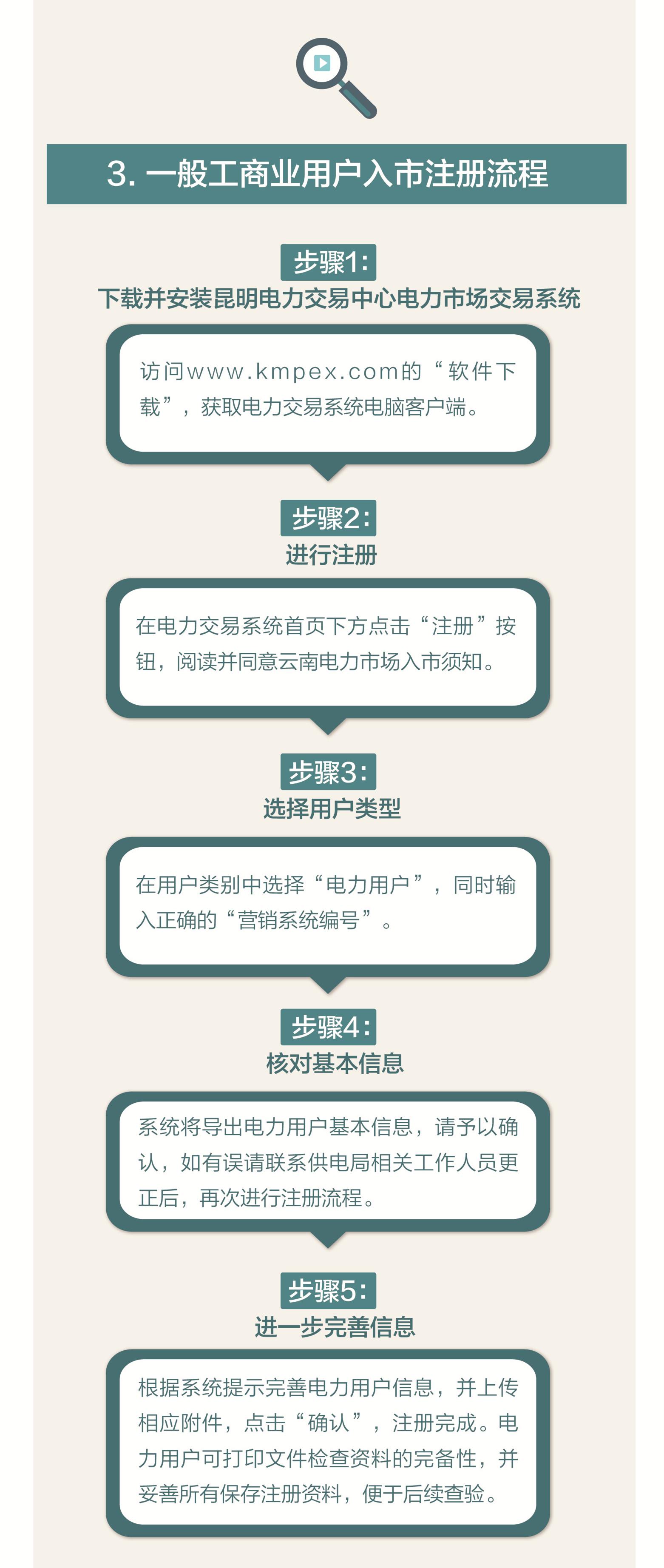 2018年10月22日起,昆明電力交易中心發(fā)布《關(guān)于云南電力市場受理一般工商業(yè)用戶注冊的公告》,正式受理一般工商業(yè)用戶參與電力市場,標(biāo)志著云南成為全國首個全面開放一般工商業(yè)用戶參與電力市場的省份。在此,我們熱忱歡迎每一位納入市場準(zhǔn)入范圍的一般工商業(yè)電力用戶成為云南電力市場的重要一員。
