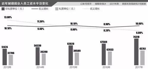 國企工資決定機制市場化加速有著現(xiàn)實考量。國家統(tǒng)計局數(shù)據(jù)顯示,去年全國城鎮(zhèn)非私營單位就業(yè)人員年平均工資為74318元, 同比名義增長10%,增速比2016年加快1.1個百分點。扣除物價因素,實際增長8.2%。而當年全國城鎮(zhèn)私營單位就業(yè)人員年平均工資為45761元,同比名義增長6.8%,實際增長5%。可見在我國,非私營單位工資,無論是工資總額還是名義增速和實際增速都遠遠高于私企。