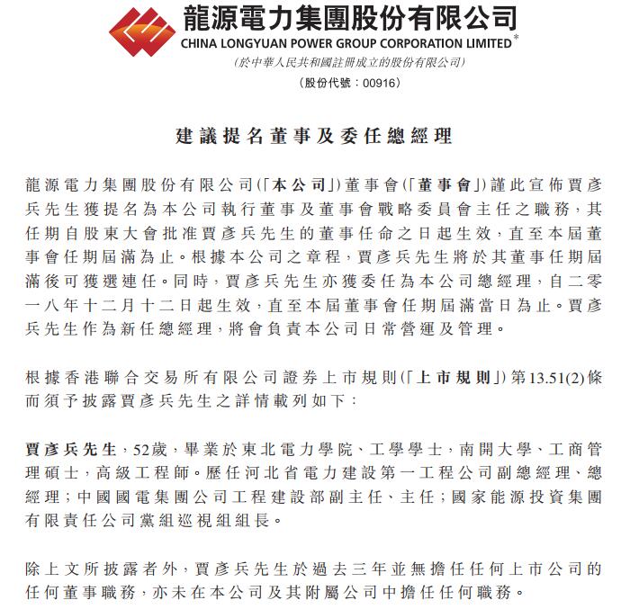龍?jiān)措娏Πl(fā)布公告稱,提名賈彥兵為執(zhí)行董事及董事會(huì)戰(zhàn)略委員會(huì)主任 ,任期自股東大會(huì)批準(zhǔn)其董事任命之日起生效,直至本屆董事會(huì)任期屆滿為止。