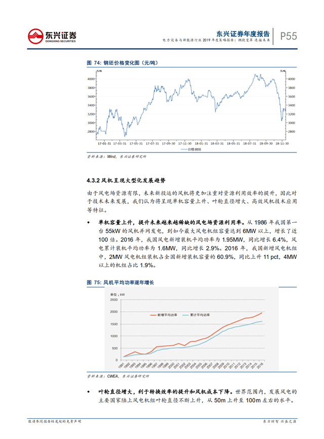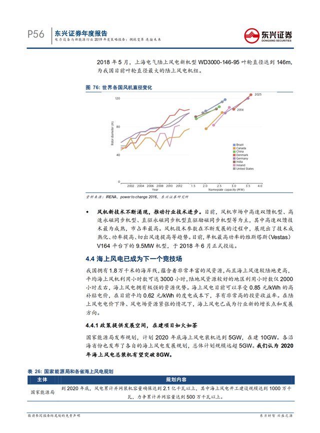 風(fēng)電行業(yè)在陸上風(fēng)資源越來越稀缺的背景下,發(fā)展重心開始往海上轉(zhuǎn)移,海上風(fēng)電大型風(fēng)機(jī)將是主要發(fā)展方向。2019年風(fēng)電將進(jìn)入競價配置時代,平價上網(wǎng)進(jìn)度被進(jìn)一步加快,發(fā)電量消納將成為影響風(fēng)電行業(yè)的重要因素。