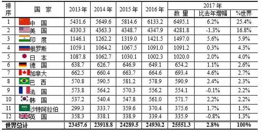 2013~2017年主要國(guó)家的電力生產(chǎn)量(單位:TWh)