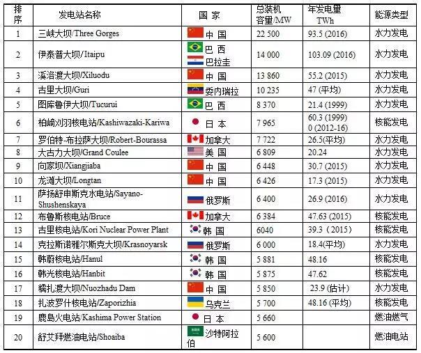 在世界上前20位發(fā)電站中,中國(guó)水力發(fā)電占有5席,均為水力發(fā)電。世界上最大的20座發(fā)電站每年都有所變動(dòng),加拿大羅伯特-布拉薩大壩從原有的第17位沖到第7位;韓國(guó)古里核電站發(fā)展壓水反應(yīng)堆也沖入第13位,超過本國(guó)的韓蔚核電站和韓光核電站。另外值得注意的是燃煤發(fā)電和燃?xì)獍l(fā)電已經(jīng)踢出前20強(qiáng)了。水力發(fā)電和核能發(fā)電均屬清潔能源發(fā)電,獨(dú)霸前20強(qiáng),化石燃料發(fā)電的地位逐步降低。