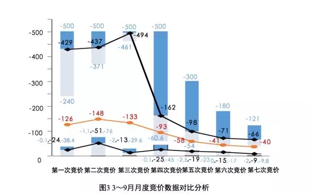廣東電力市場(chǎng)2016年3~9月月度競(jìng)價(jià)數(shù)據(jù)對(duì)比分析如圖3所示。深藍(lán)色部分為發(fā)電廠或大用戶(售電公司)所申報(bào)的絕對(duì)值較大的價(jià)差(負(fù)值),淺藍(lán)色部分為發(fā)電廠或大用戶(售電公司)所申報(bào)的絕對(duì)值較小的價(jià)差(負(fù)值),黑色點(diǎn)與實(shí)線表示平均申報(bào)價(jià)差。橙色點(diǎn)與實(shí)線表示平均結(jié)算價(jià)差,代表發(fā)電廠向需求方平均讓利的程度。根據(jù)數(shù)據(jù)分析我們可以得到如下結(jié)論: