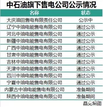 全國(guó)工商系統(tǒng)顯示,大慶油田售電有限責(zé)任公司旗下有11家中油電能售電公司。分別為遼寧、河北、新疆、廣西、甘肅、吉林、天津、四川、寧夏、內(nèi)蒙古、陜西中油電能售電有限公司;已經(jīng)有9家售電公司在交易中心通過(guò)了公示,其中天津、河北中油電能售電在北京交易中心公示。