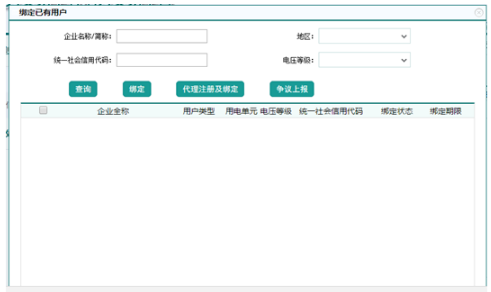 2. 新增代理用戶。如果售電公司要綁定的用戶在系統(tǒng)中不存在,則可以點(diǎn)擊“代理注冊(cè)及綁定”,通過(guò)此功能新增用戶及相應(yīng)的用電單元。如下圖所示: