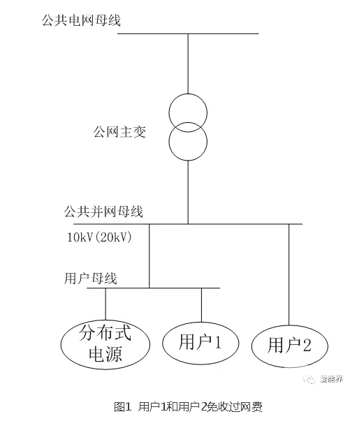 電力用戶(含微電網(wǎng)內(nèi)部)自發(fā)自用及在10(20)千伏電壓等級且同一變電臺區(qū)內(nèi)消納,免收過網(wǎng)費,例如圖1中用戶1和用戶2免收過網(wǎng)費。