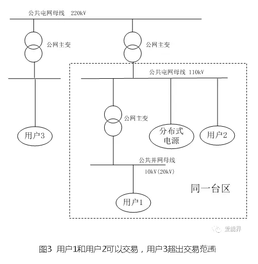 35-110千伏接入電網(wǎng)且跨臺區(qū)消納,過網(wǎng)費標準為國家核定的本地區(qū)最高輸配電價扣除該臺區(qū)最高電壓等級的上一電壓等級輸配電價,例如圖2中用戶3為跨臺區(qū)消納,過網(wǎng)費標準為國家核定的本地區(qū)最高輸配電價扣除該電壓等級2對應(yīng)的輸配電價。需要注意的是圖3中用戶3超過最大交易范圍,不能參與分布式發(fā)電交易。