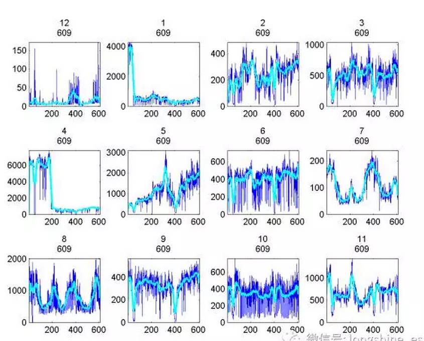 圖1 任選12個用戶的日電量曲線(639天),藍線為實際電量,綠線為平滑線