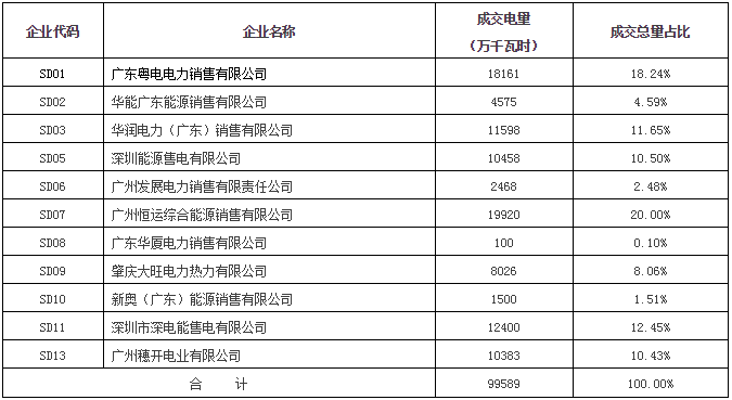 由上表可見(jiàn),廣州發(fā)展電力銷售有限責(zé)任公司未中標(biāo)成交,而廣東粵電電力銷售有限公司和廣州恒運(yùn)綜合能源銷售有限公司合計(jì)成交電量占到售電公司總購(gòu)電量的一半以上。
