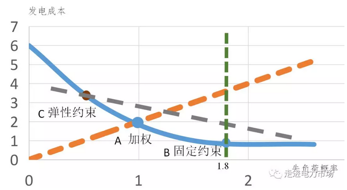 3)彈性約束。考慮到可靠性的成本,在不同的發(fā)電成本下,可以有不同的可靠性:發(fā)電成本非常高的時候,可以適當(dāng)?shù)慕档涂煽啃约s束,在發(fā)電成本非常低的時候,可以適當(dāng)提高可靠性約束。如圖中的灰色虛線所示,其與帕累托前沿相交,就得到了最優(yōu)運行點C點。