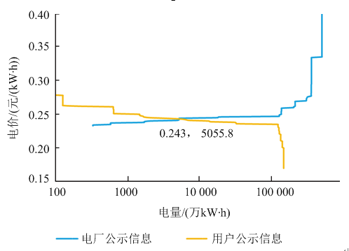 2017年3月,云南電力市場共有154家發(fā)電企業(yè)、1540家用電企業(yè)參與了發(fā)用電側(cè)雙向掛牌交易,信息公示情況如圖3所示,對應(yīng)的供需曲線如圖4所示。用電企業(yè)公示電量14.06億kW•h,均價0.233元/(kW•h),發(fā)電企業(yè)公示電量47.43億kW•h,均價0.281元/kW•h。按照雙方的公示信息,在傳統(tǒng)“高低匹配”競價模式下,本輪交易最大成交電量僅5 055.8萬kW•h,用戶側(cè)成交率3.6%。由此可見,購售雙方的初始期望分歧較大。