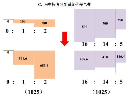 在圖 A中,有 3 個售電公司(購電方)和 3個發(fā)電企業(yè)(供電方)在拍賣中中標(biāo)。例如,發(fā)電企業(yè)中的最低報價是以-400 的相對價格供應(yīng) 2 個單位的電量。市場出清價格應(yīng)該是-200(供給曲線與固定交易量曲線的交叉點),而且所有售電公司都應(yīng)該支付這個價格。