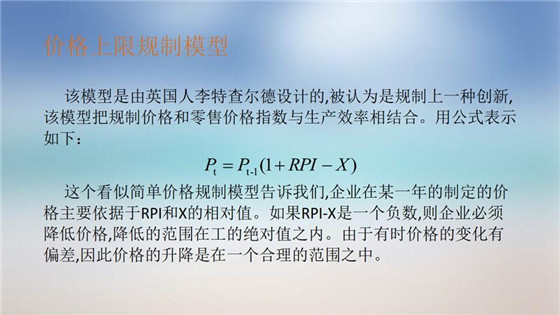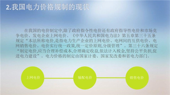 在縱向一體化的電力產(chǎn)業(yè)中,發(fā)電、輸電、配電、售電捆綁經(jīng)營,統(tǒng)一進行成本核算,形成了最終的銷售電價,電價規(guī)制的主要目標是抑制電力經(jīng)營企業(yè)制定壟斷價格,以保護廣大消費者利益。