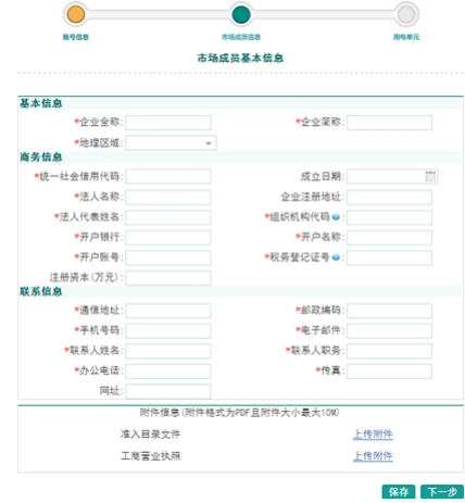 用戶需要填寫市場(chǎng)成員的基本信息,包括基本信息、商務(wù)信息、聯(lián)系信息等,然后上傳要求的全部附件信息,附件文件類型必須為 pdf 格式(大小不超過(guò) 10M)。工商營(yíng)業(yè)執(zhí)照未三證合一的需掃描到一個(gè) pdf 中進(jìn)行上傳,準(zhǔn)入目錄文件把附件 1 上傳。