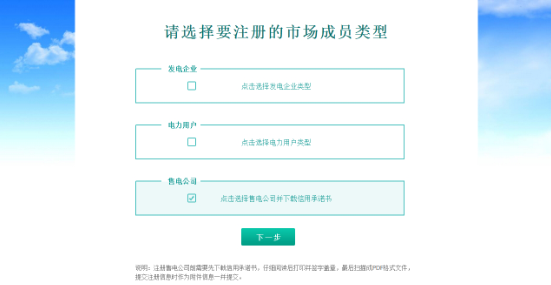 選擇售電公司,點擊后會自動下載售電公司信用承諾書,然后點擊下一步進行售電公司注冊。需要注意的是,下載的信用承諾書,需要打印并簽字蓋章,最后掃描成電子版,提交注冊信息時作為附件信息一并提交。