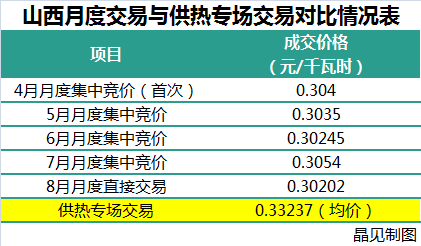 根據(jù)文件規(guī)定的上網(wǎng)電價(jià),成交電廠的平均上網(wǎng)電價(jià)是0.33883元/千瓦時(shí)。也就是說(shuō),交易結(jié)果中的成交均價(jià)并沒(méi)有超過(guò)這些供熱機(jī)組的上網(wǎng)電價(jià)。雖然這個(gè)均價(jià)沒(méi)有超過(guò)平均上網(wǎng)電價(jià),但是與山西4~8月的月度集中競(jìng)價(jià)的成交價(jià)格對(duì)比依然高出了許多。