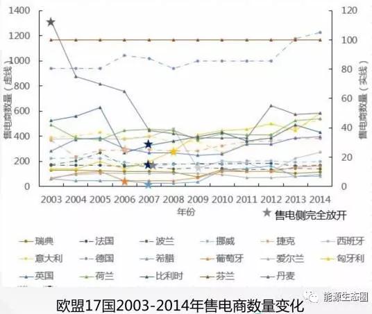 上圖顯示的是歐盟13個國家,2003-2014年售電商數(shù)量的變化。從上圖可以看出,大部分國家售電商的數(shù)量還是比較平穩(wěn)的。五角星的地方表示售電側從工業(yè)側開放到居民側的時間節(jié)點,可以看到五角星出現(xiàn)的前后數(shù)據(jù)沒有發(fā)生很大的波動,也就是說,售電公司的數(shù)量不會因為工業(yè)側或者居民側的開放而發(fā)生較大的變化,這也就意味著要進入售電市場就要從一開始進入,跟隨市場一起成長。