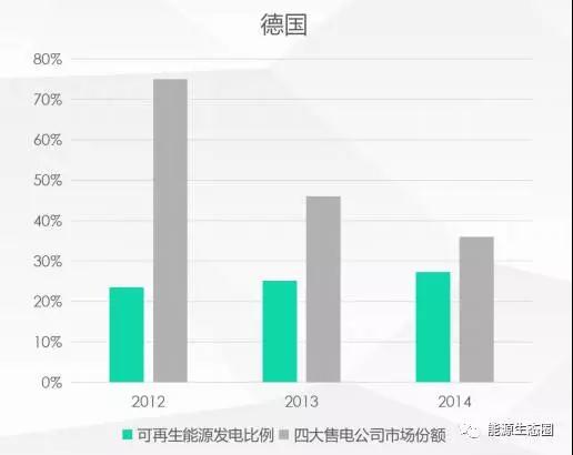 德國分布式能源發(fā)展的比較好。分布式能源其中一個特點是投資比較小,小型的售電公司完全可以承擔,并且有些售電公司非常善于做售電+金融的結合,即售電公司為用戶進行投資,用戶從電費中回收投資,這樣的模式使得小的售電公司有比較穩(wěn)定的現(xiàn)金流和發(fā)電資產(chǎn),同時跟用戶建立了良好的關系。所以德國在分布式能源發(fā)展比較好的情況下,特別是光伏、風電領域,原來的四大傳統(tǒng)售電公司市場份額有所降低,小型的售電公司開始爭奪用戶側可再生能源的資源以及售電資格。