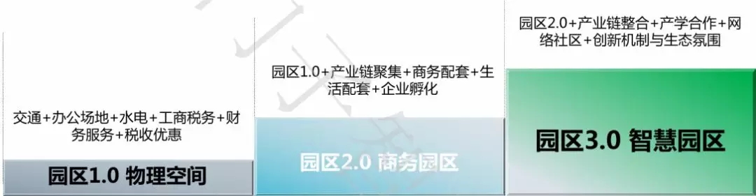 園區(qū)3.0:在2.0的基礎上加上產(chǎn)業(yè)鏈的整合、網(wǎng)絡化、提供創(chuàng)新機制和生態(tài)氛圍,借助共享經(jīng)濟及IT技術,構筑智慧園區(qū)。