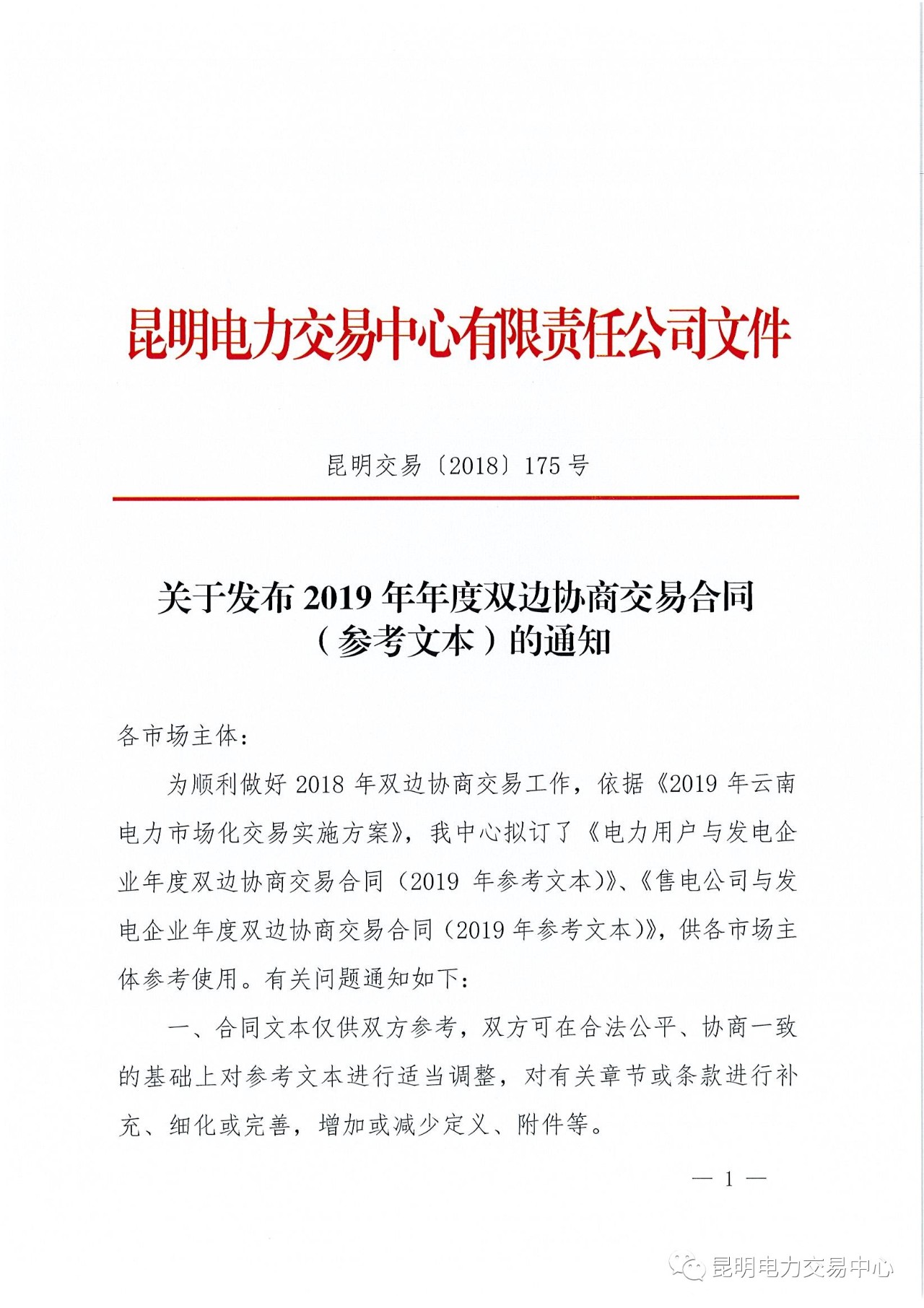 云南2019年年度雙邊協(xié)商交易合同(參考文本)發(fā)布