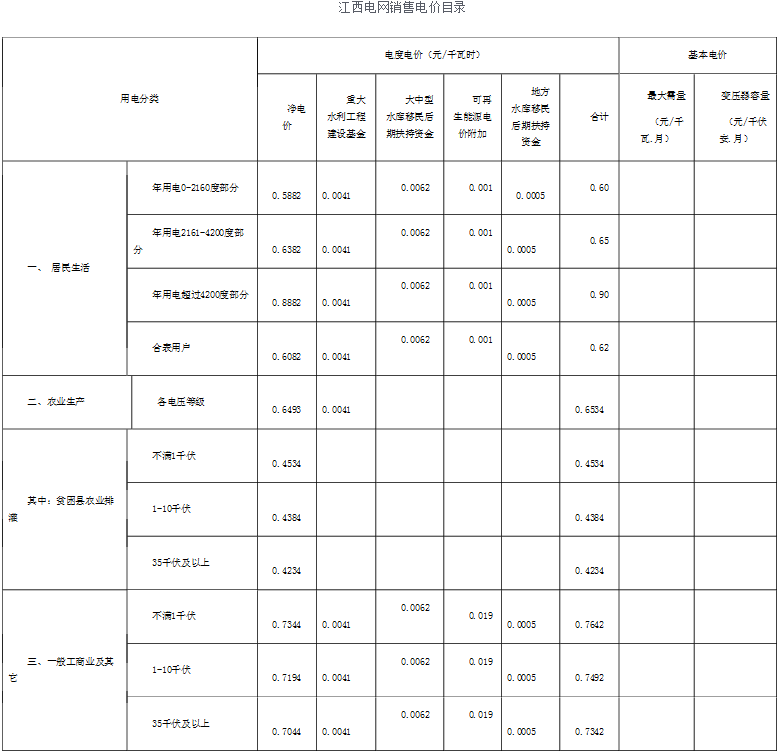 自2018年4月1日起,江西電網(wǎng)“一般工商業(yè)及其它用電”類別各電壓等級銷售電價、輸配電價每千瓦時降低1.6分錢。調(diào)整后的具體電價標(biāo)準(zhǔn)見附件。