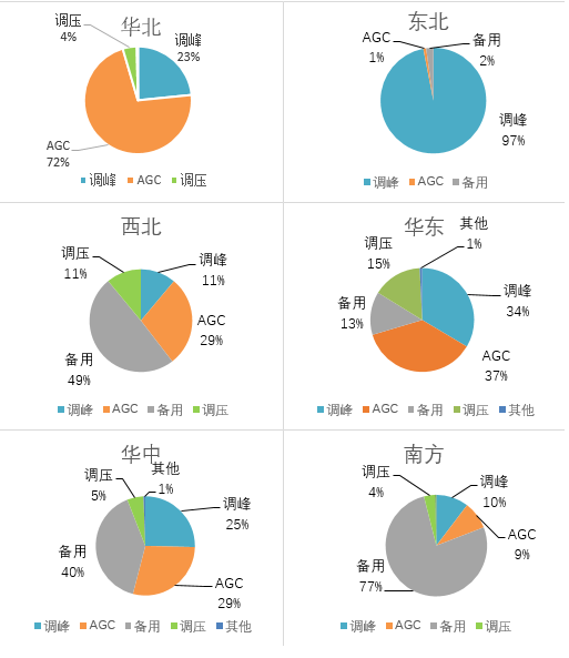 從分項(xiàng)電力輔助服務(wù)補(bǔ)償費(fèi)用來(lái)看,調(diào)峰、AGC和備用補(bǔ)償費(fèi)用占總補(bǔ)償費(fèi)用的90%以上。其中,西北、東北區(qū)域調(diào)峰補(bǔ)償力度最大,華北、華東區(qū)域調(diào)頻(西北區(qū)域調(diào)頻為AGC加一次調(diào)頻,其他區(qū)域調(diào)頻為AGC)補(bǔ)償力度最大,南方、華中區(qū)域備用補(bǔ)償力度最大。總體來(lái)看,西北區(qū)域整體電力輔助服務(wù)補(bǔ)償力度最大(見(jiàn)圖3)。