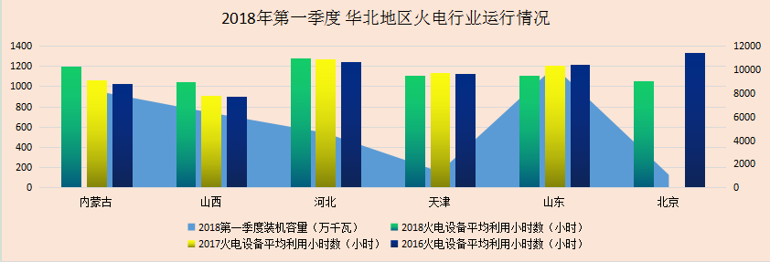 2018年第一季度,華北地區(qū)火電設(shè)備平均利用小時(shí)數(shù)有明顯上升,但是各省差距較為明顯,其中河北省最高,達(dá)到1282小時(shí),山西最低,僅為1048小時(shí)。值得關(guān)注的是,去年迎峰度冬以來,北京緊急啟動(dòng)燃煤機(jī)組,2018年第一季度也保持了較高的設(shè)備平均利用小時(shí)數(shù),也達(dá)到1056小時(shí)。另外,山東、天津火電設(shè)備平均利用小時(shí)數(shù)出現(xiàn)了一定幅度的下滑,同比下滑幅度分別達(dá)到29小時(shí)、100小時(shí)。